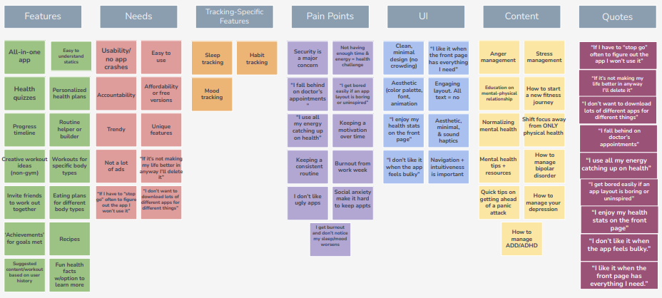 Through the use of this visual tool in a brainstorming session, I was able to organize the qualitative data into different categories based on their relationships to one another. The patterns found in the data allowed me to plan for content and features to include once the designing begins. The categories are: Features, Needs, Tracking Tools, Pain Points, UI, Content, and relevant quotes provided by participants.