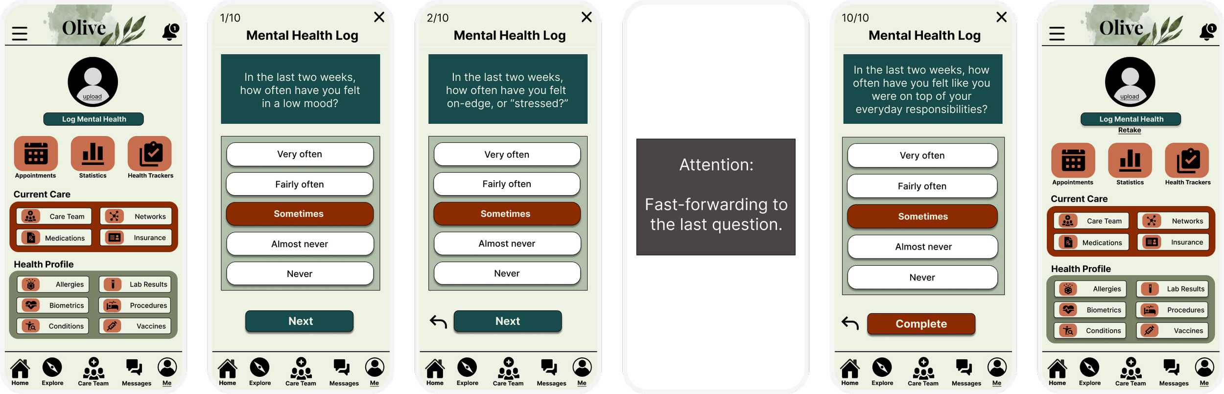 This health questionnaire was designed for tracking fluctuations in mental health patterns through a daily or periodic check-in that asks the same 10 questions for consistent results over time, as well as insights. The initial navigational flow for this function was initially the Me tab > ‘Daily Check In’ button at the top > prompting the questionnaire.