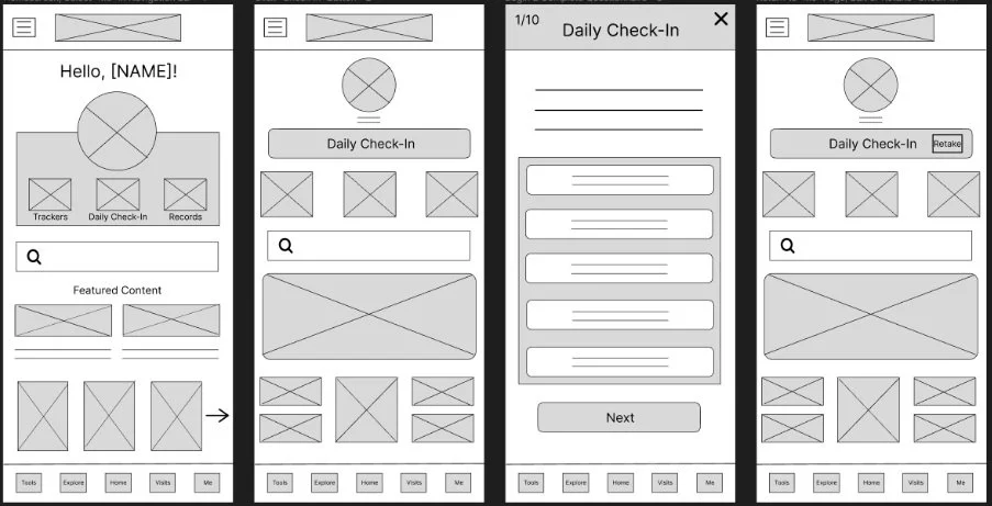 Feedback indicated that “Daily Check In” was ambiguous in wording, and 5 out of 6 participants thought this was an appointment check in feature. To improve this design I offered a direct link under ‘Programs and Tools’ which was added to the homescreen. Another route to reach this feature was through the ‘Me’ tab in the navigation bar at the bottom of the screen.
