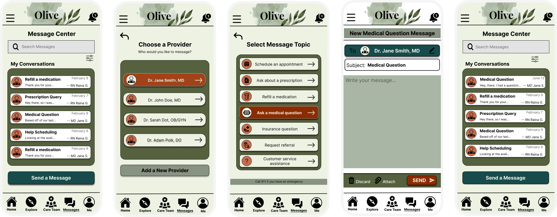 My initial idea behind Olive’s messaging portal, and for the flow of sending a message to a healthcare provider, was to use the Visits tab > click Messages > Send a Message; however, usability testing indicated that this navigational flow was not intuitive.