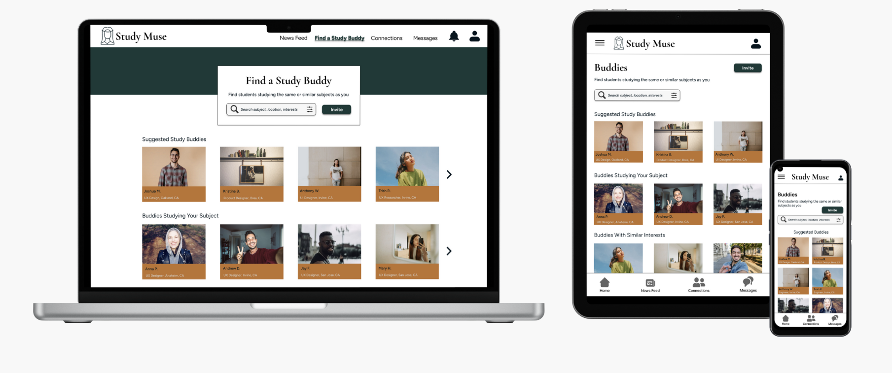 As Study Muse is a responsive web app, I completed the project by adapting the screens for different devices and working off of a mobile-first approach to ensure the design stayed consistent in its responsive properties among mobile, tablet, and desktop breakpoints.
