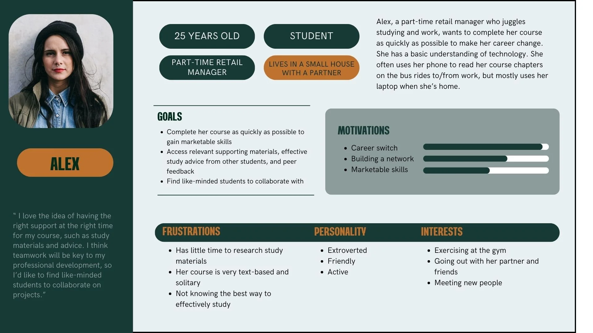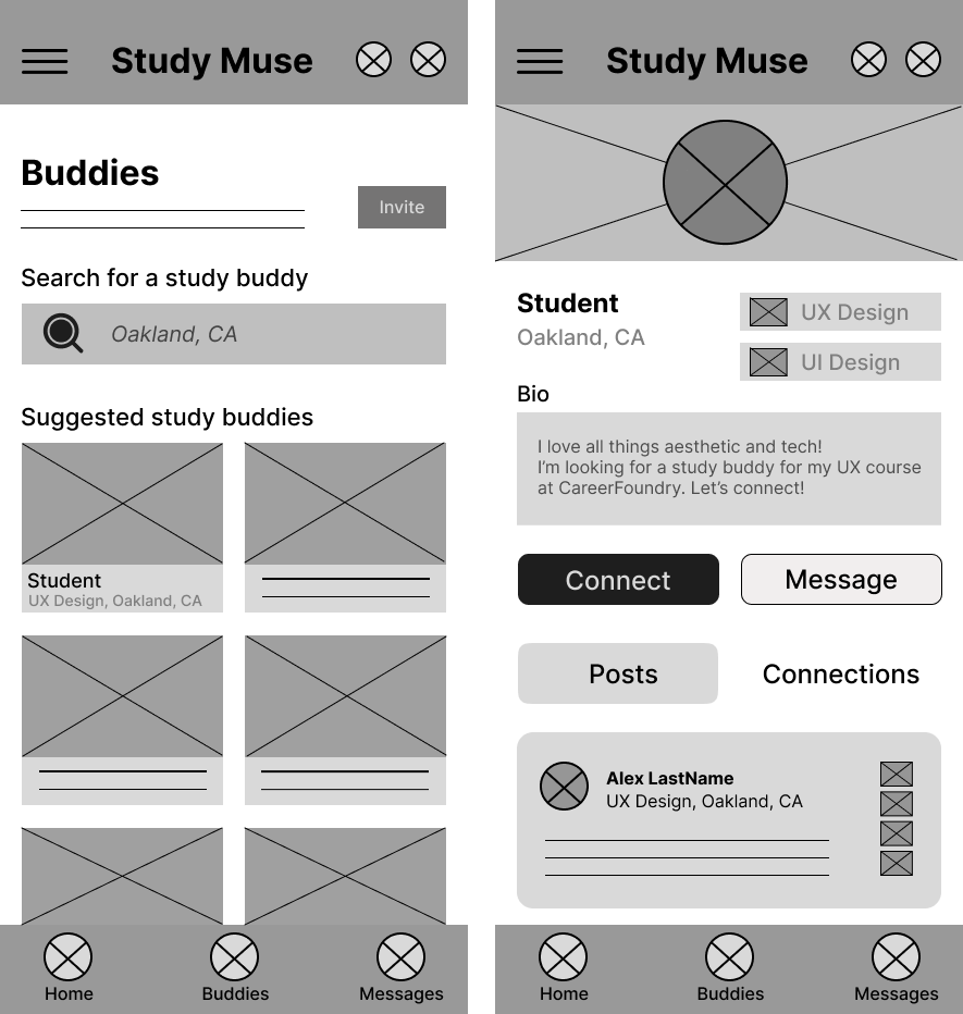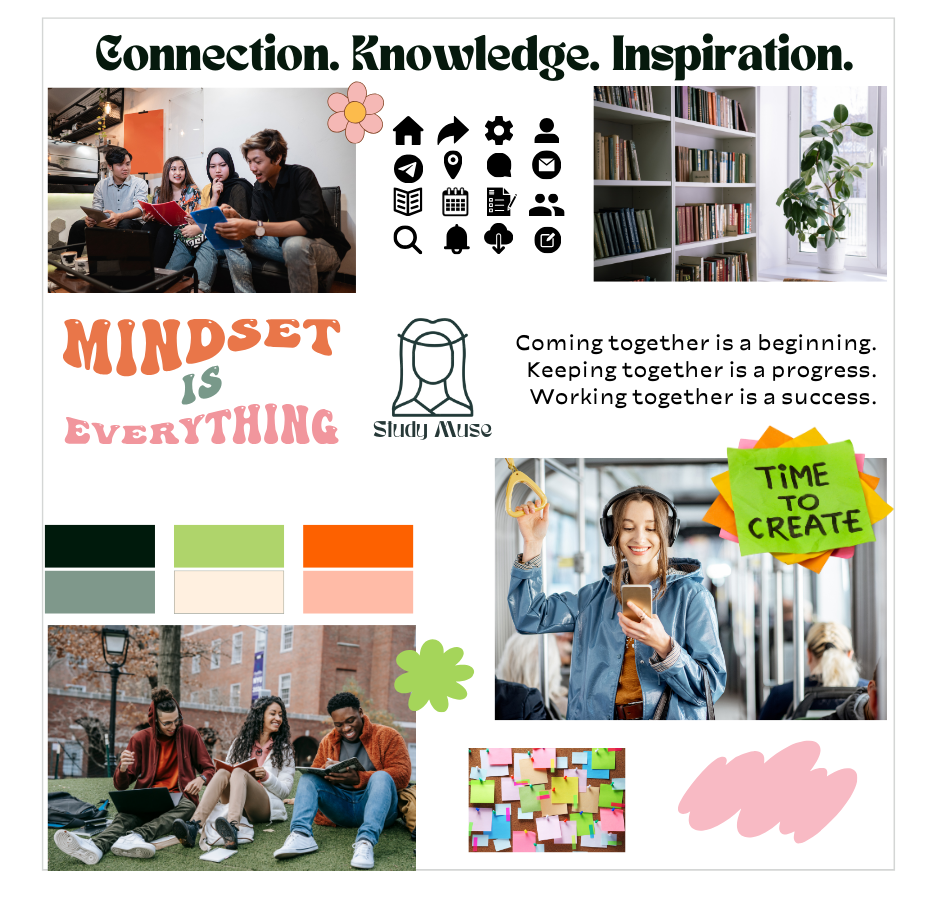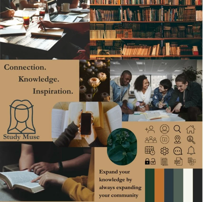 I felt the first mood board aligned more with the project brief, appealing to curious, professionally growth-focused students who want to connect over their subjects of interest. The second board, while lively and eye-catching, may not produce a sense of reliability or maturity for users who are taking their learning development seriously and are using this app to make connections and achieve their academic goals. Mood board #1 displays familiar and welcoming imagery like books, warm coffee shops, and groups of engaged peers.